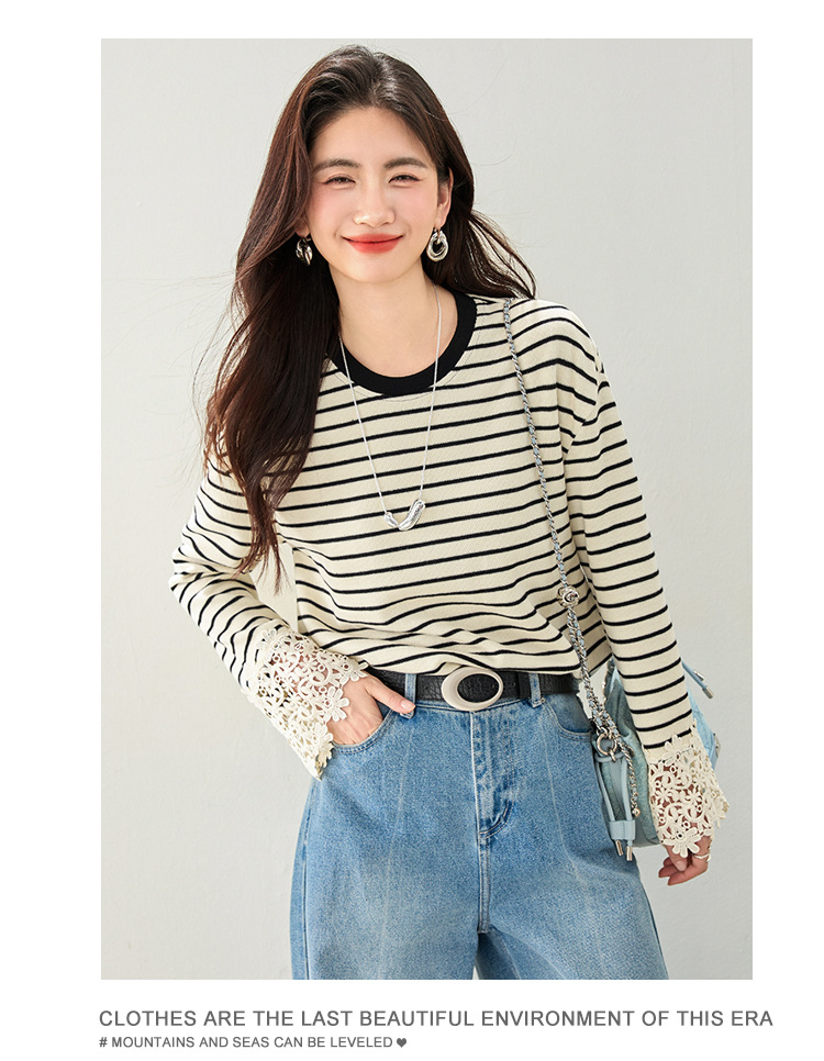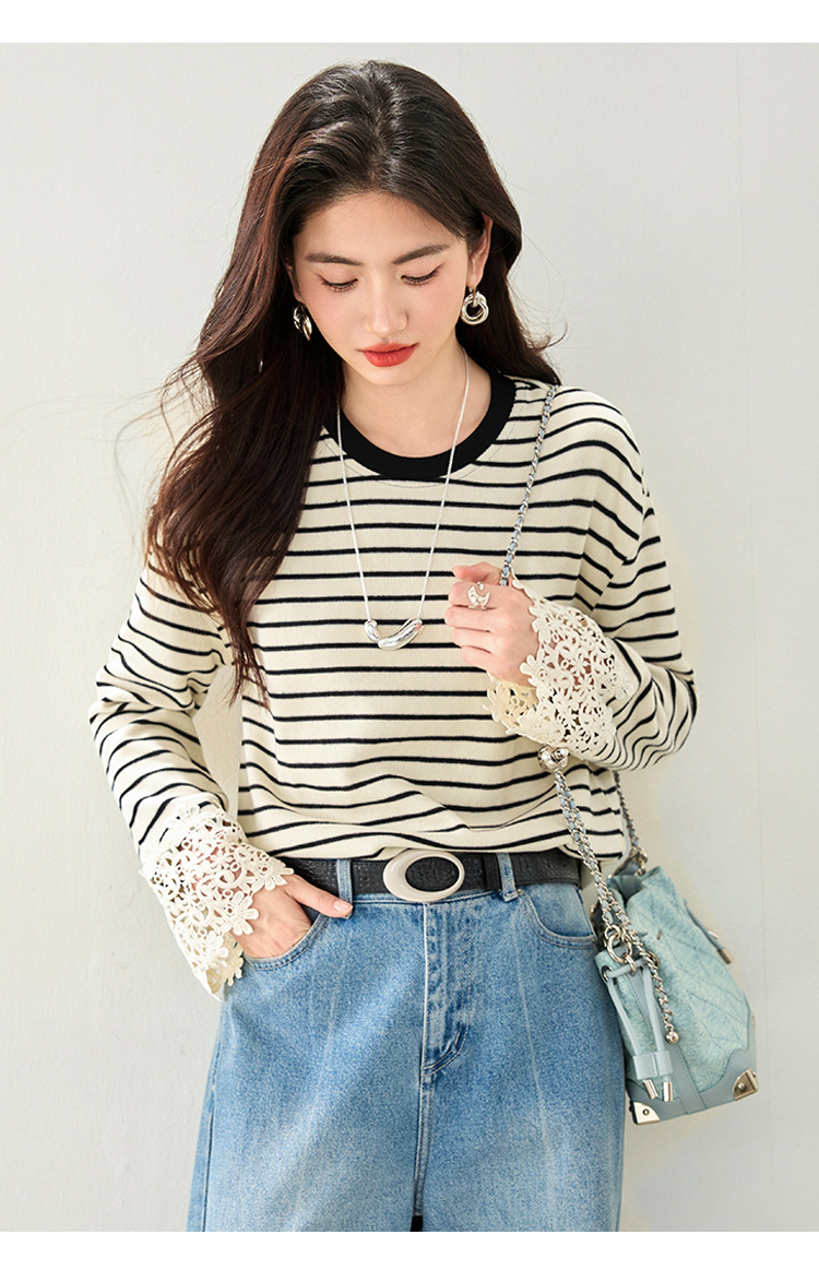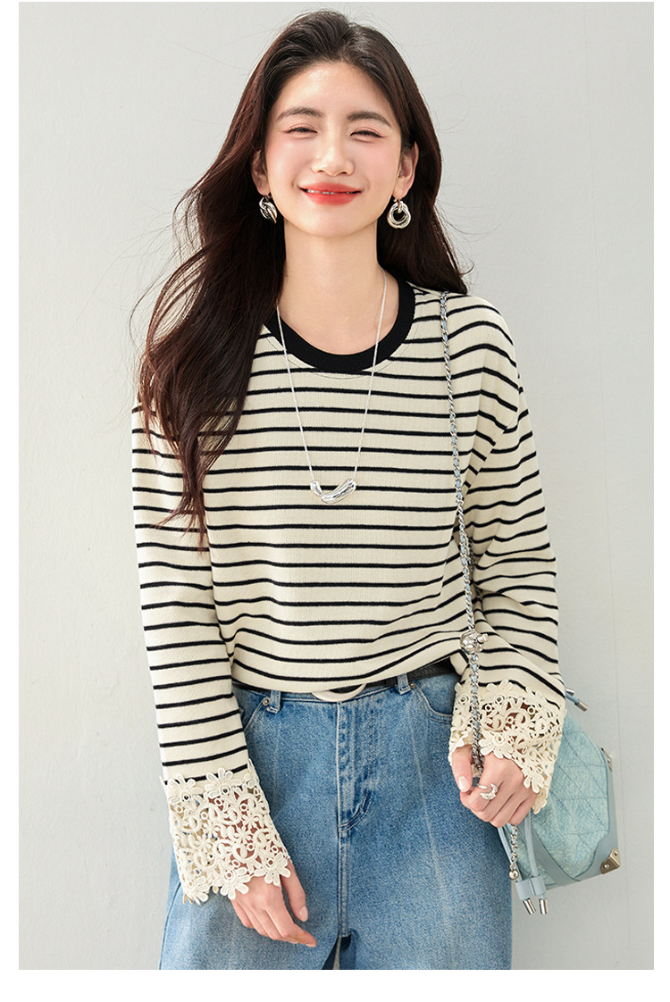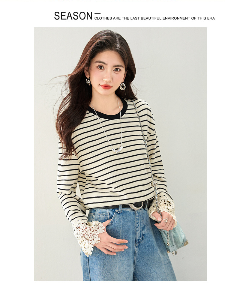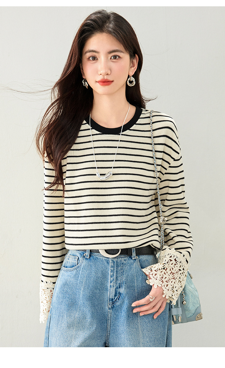 This Korean-style striped top blends casual charm and elegance, featuring delicate lace flare sleeves and a flattering cinched waist.